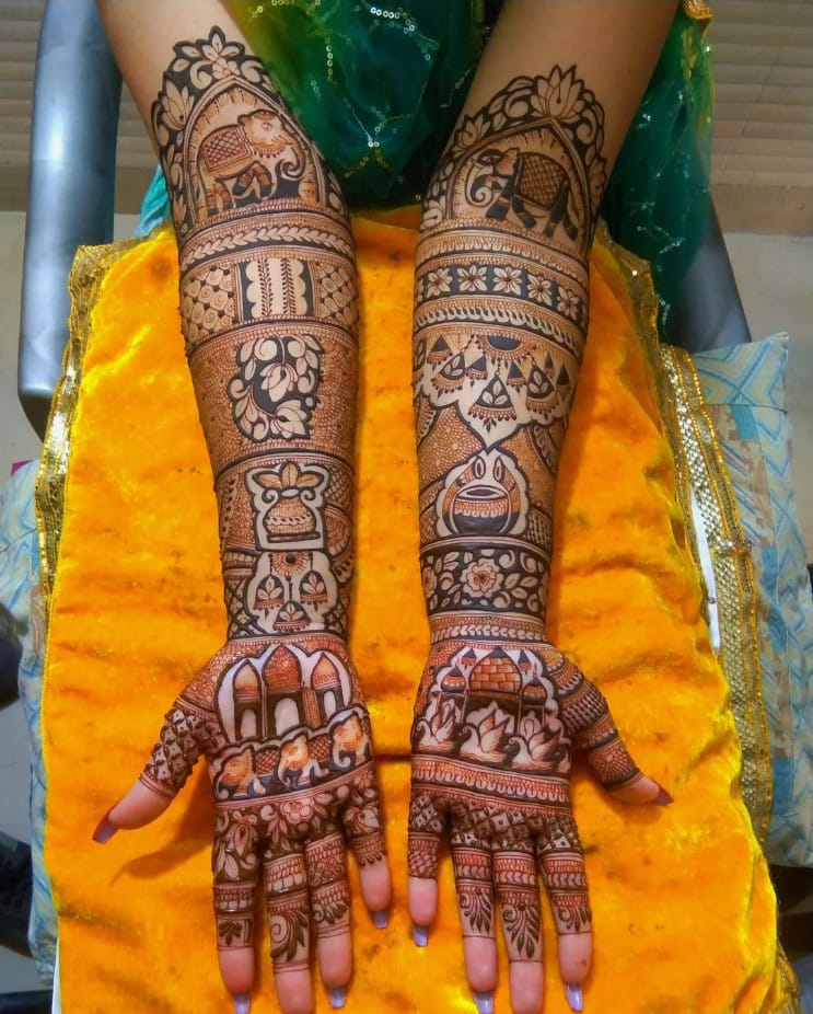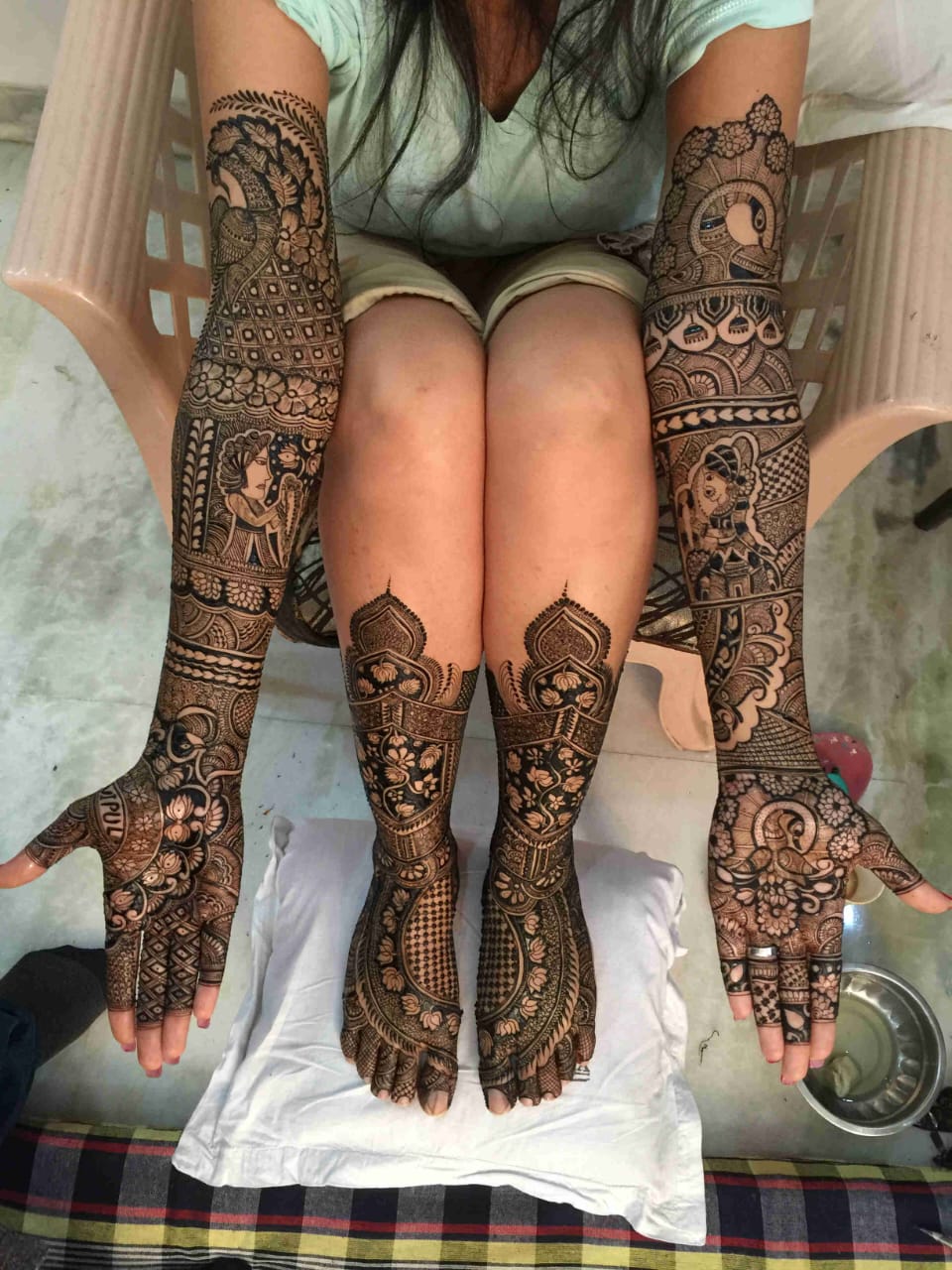 Bridal mehndi, or henna designs, are often applied in India. Mehndi, also called a henna tattoo, is a traditional temporary skin decoration using henna that is often applied for weddings in India.